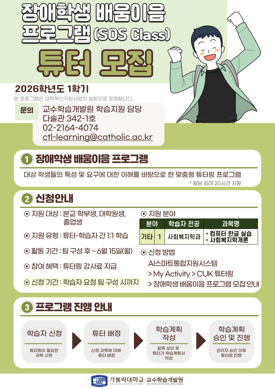 [Center for Teaching & Learning] Recruitment Notice for Tutors in the 2026 Spring Semester “SOS Class” Learning Support Program for Students with Disabilities