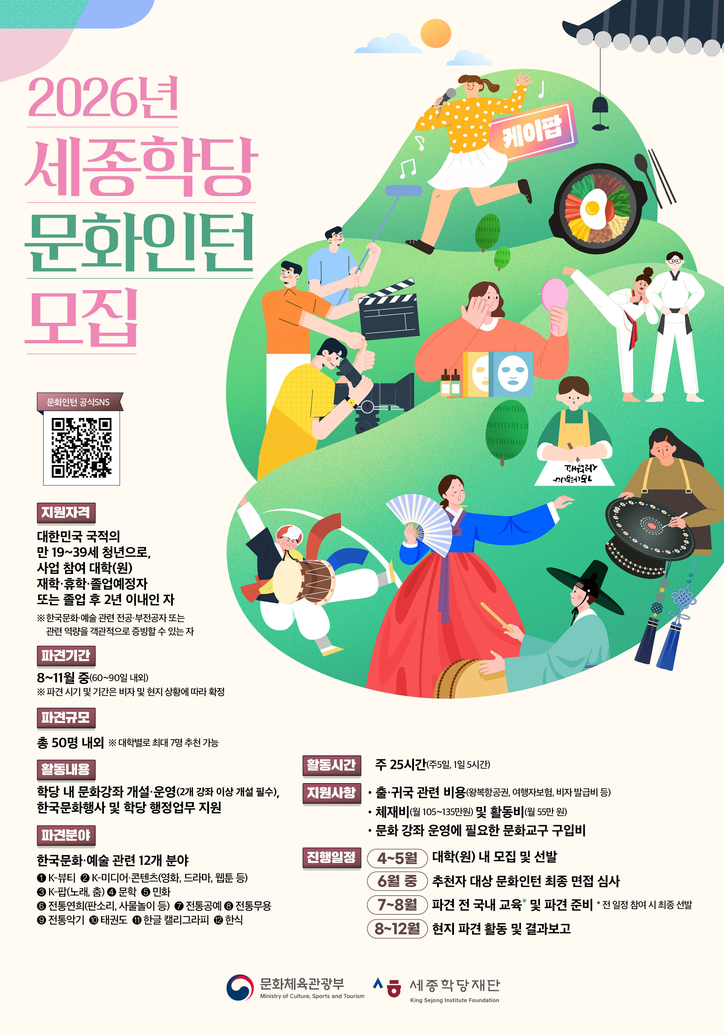 2. Submission documents: <2026 King Sejong Institute Cultural Intern> application form, self-introduction letter and cultural internship activity plan, consent form to provide personal information, and other qualification documents (limited to those concerned)