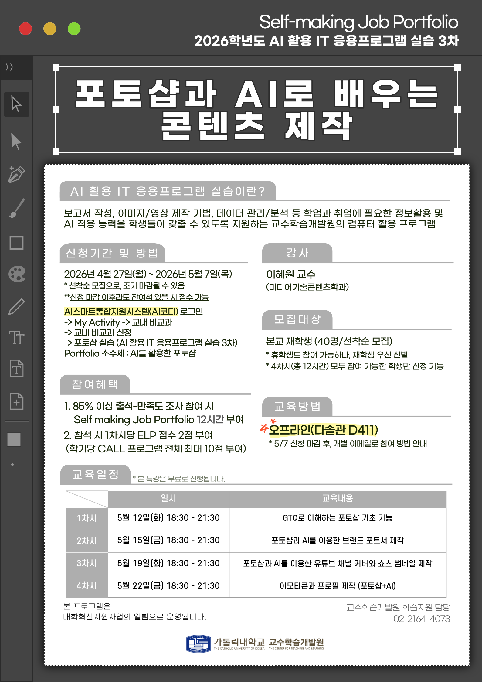 [Center for Teaching & Learning] Recruitment for Participants: AI-based IT Application Practice (3rd Session) – “Content Creation with Photoshop and AI”