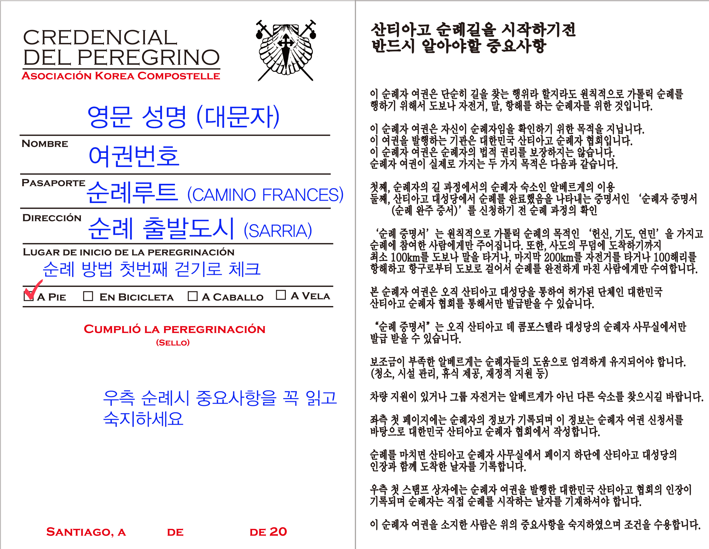 순례자여권은 대한민국 산티아고 순례자 협회에서 기부제로 운영하고 있습니다.