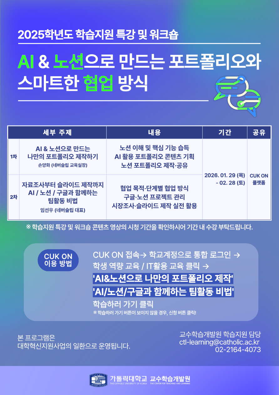 교수학습개발원에서는 ‘AI & 노션으로 만드는 포트폴리오와 스마트한 협업 방식’을 주제로 동영상 콘텐츠를 1차와 2차로 준비하여 CUK-ON 플랫폼에 게시합니다.