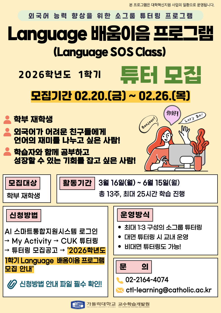 • 지원분야 : 외국어 과목 (영어, 중국어 등 다양한 외국어의 회화, 작문, 문법/독해) • 지원기간 : 2026년 2월 20일(금) ~ 2026년 2월 26일(목) • 지원방법 : AI 스마트통합지원시스템 로그인 – MY Activity – CUK 튜터링 – 튜터링 모집공고 – 2026학년도 1학기 Language 배움이음 프로그램 모집 안내 * 신청방법 안내 파일 필수 확인! | |||||||||