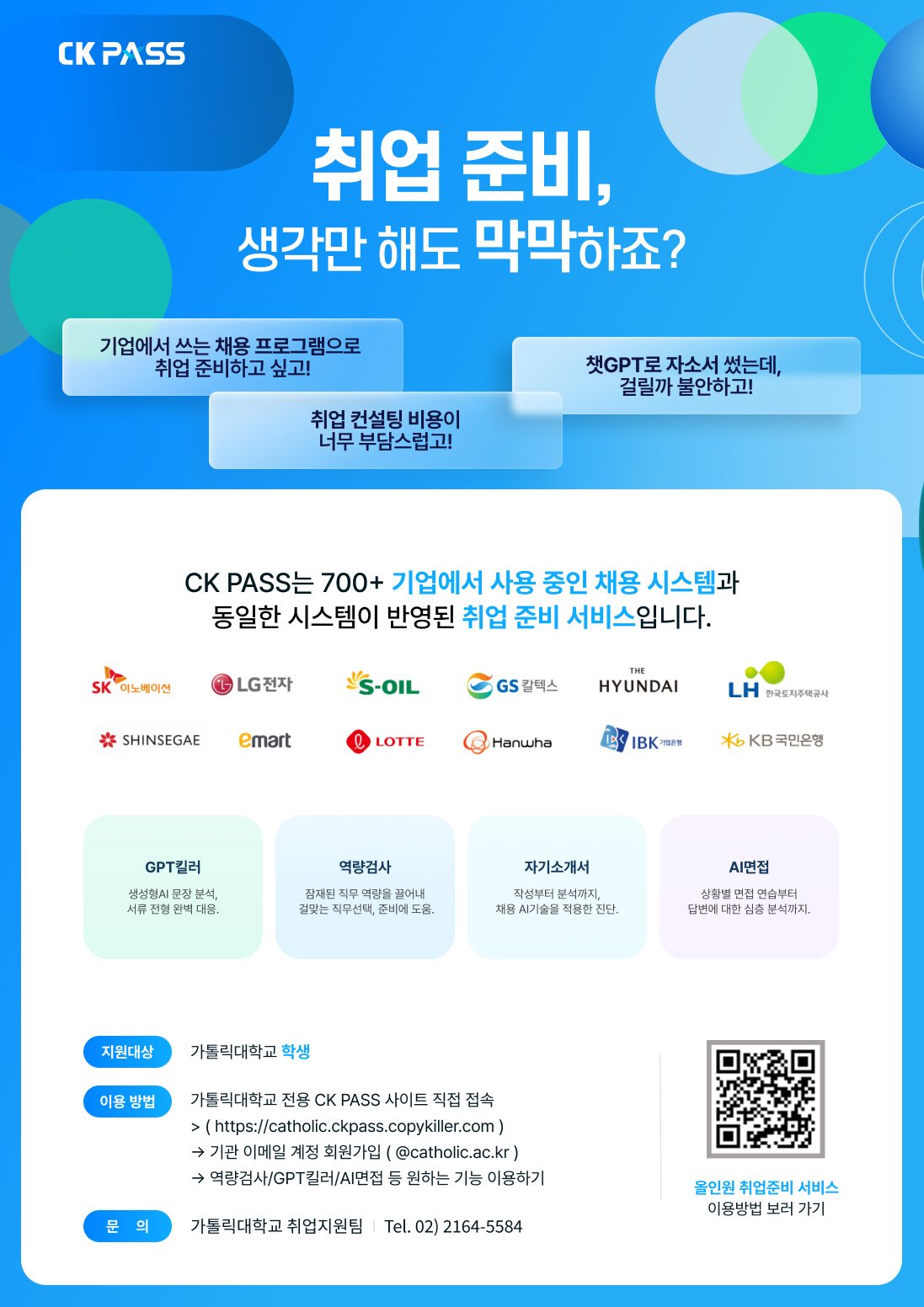 재학생들의 취업 준비를 지원하기 위해 CK PASS AI 자기소개서 점검 서비스와 AI 모의면접 서비스를 제공하고 있습니다.