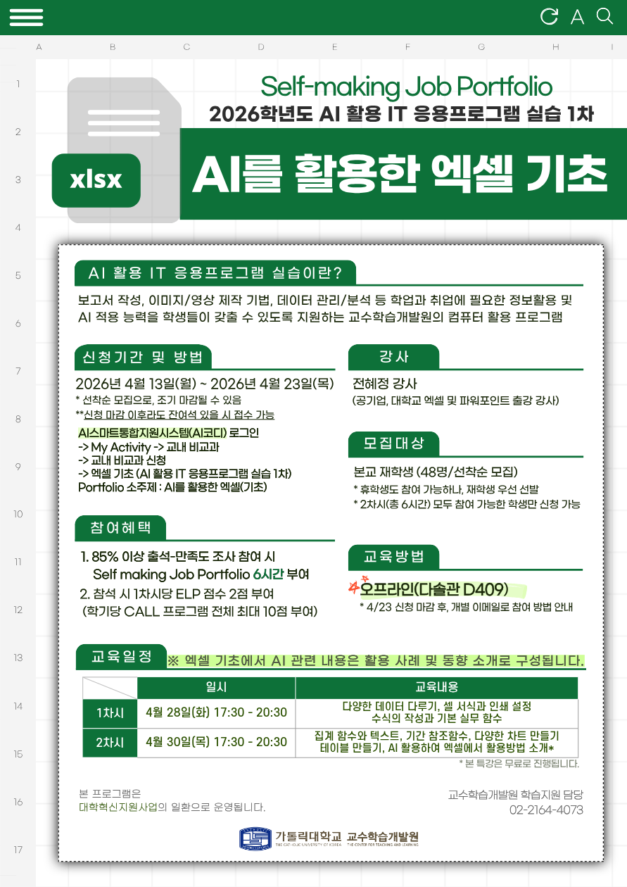 [교수학습개발원] AI 활용 IT 응용프로그램 실습 1차 - “AI를 활용한 엑셀 기초" 참가자 모집